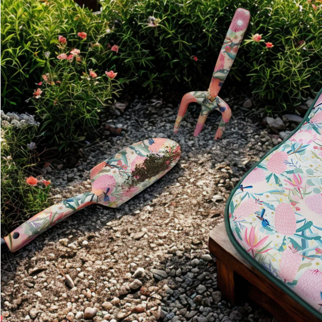 Garden fork and trowel set featuring blue wrens sitting amongst the soft subtle tones of plants and flowers, typically found in the Australian bush to your gardening routines.