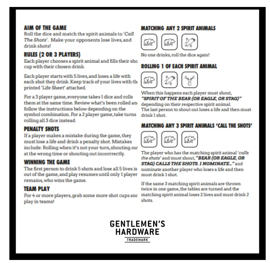 Gather around the campfire with friends to see who 'Calls The Shots' with this Campfire Call The Shots Game from Gentlemen's Hardware. Choose your spirit animal and then roll the dice to match. Make your opponents lose lives and drink shots! Be the last player to remain with lives and shots not taken in order to be crowned the ultimate shot caller! Includes x3 30ml / 1 fl oz shot cups and x3 spirit animal dice.